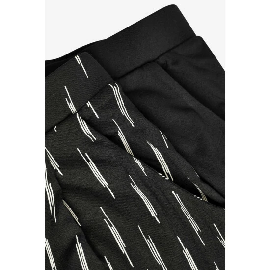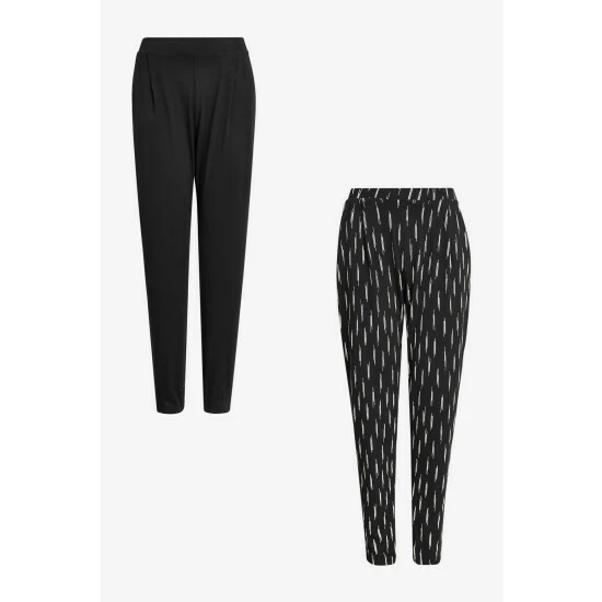A useful two pack of jersey trousers from F&F designed in a slim tapered fit with elasticated waist. The pack has one plain black and one black and white patterned pair.